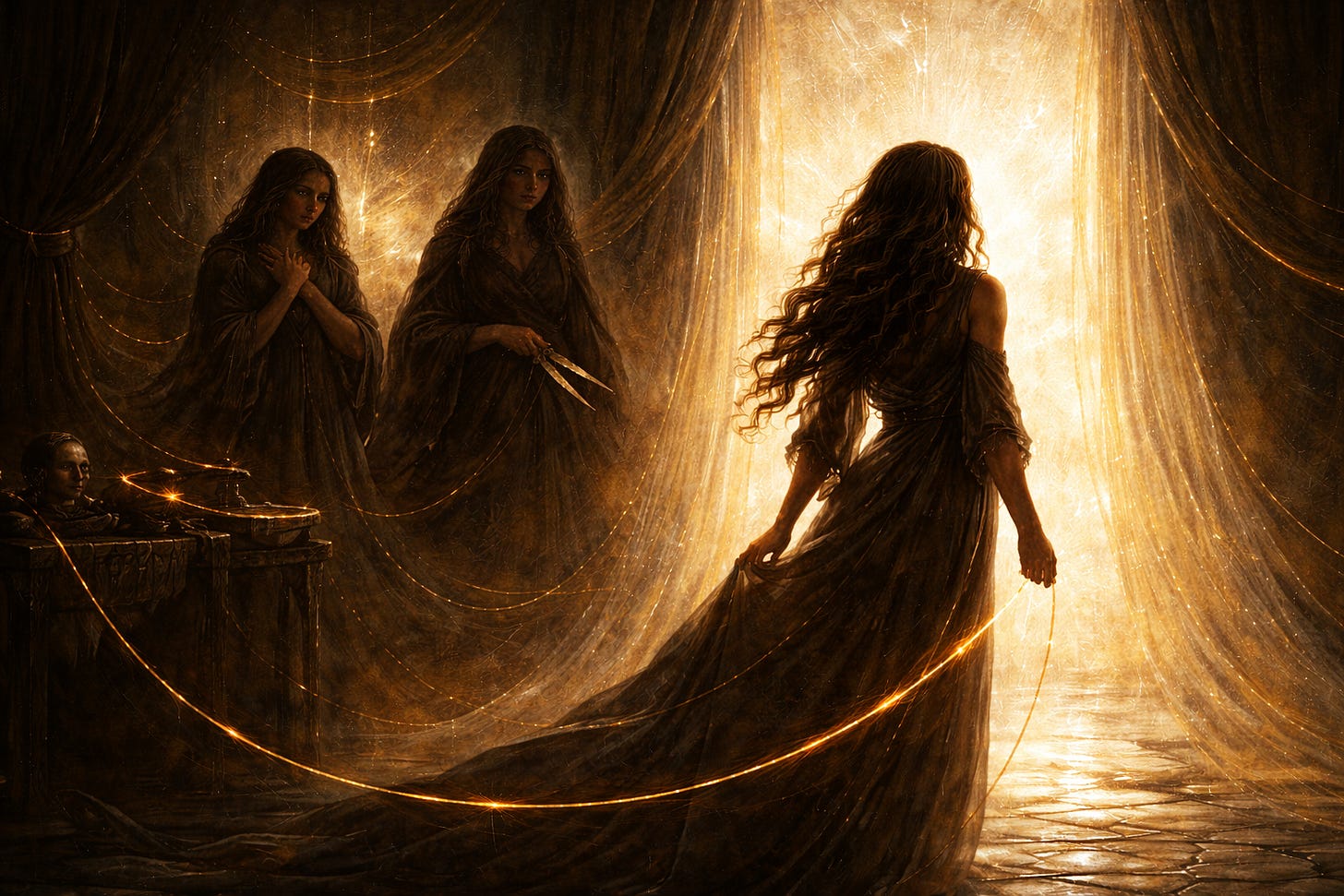 The thought clawed at her, and she wanted nothing more than to embrace them a final time, to press them so tightly against her as to etch their shapes into her skin. But already, the veil beckoned, its pull undeniable. Already, the familiar hum of the spinning threads and the crisp snip of shears began to dissolve into the stillness. And each step toward the veil lightened her as though layers of ancient dust were peeling away, leaving behind something unmarked, something new.