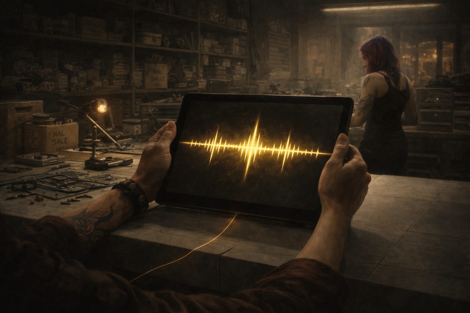 “Anyway, I’ve never seen anything like this.” Pyra opened a file on her tablet with a flick and pulled up a mess of jagged waveform data. “The tech is radical. I analyzed the audio file and—” She stopped, eyes darting as if she was still running diagnostics in her head.